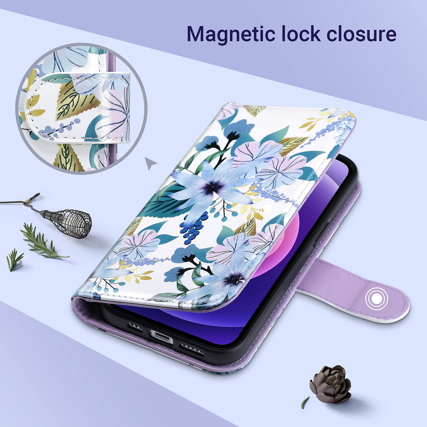 ULAK Compatible with iPhone 13 Pro Wallet Case for women. Elegant looking: fashion and luxury purple flower pattern design make your phone more eye-catching and provide great dual-layer protection to your phone.Detachable wrist strap is a great choice for you to carry it easily, also you can hang your keys or some little cute decoration.Package included: 1 x Wallet Phone case for iPhone 13 Pro 6.1 inch; 1 x Hand strap Read more Good way to keep cash , cards and phone together, so you do not need to bring a wallet when going out. Built-in foldable kickstand is really thoughtful to provide you convenient hand-free experience of video chatting or watching videos anywhere. The flip cover protects the screen against scratches and dirt, and soft durable TPU skin cover wrapping the phone well. RFID technology application effectively shields the signals and keeps your personal information safe. Read more