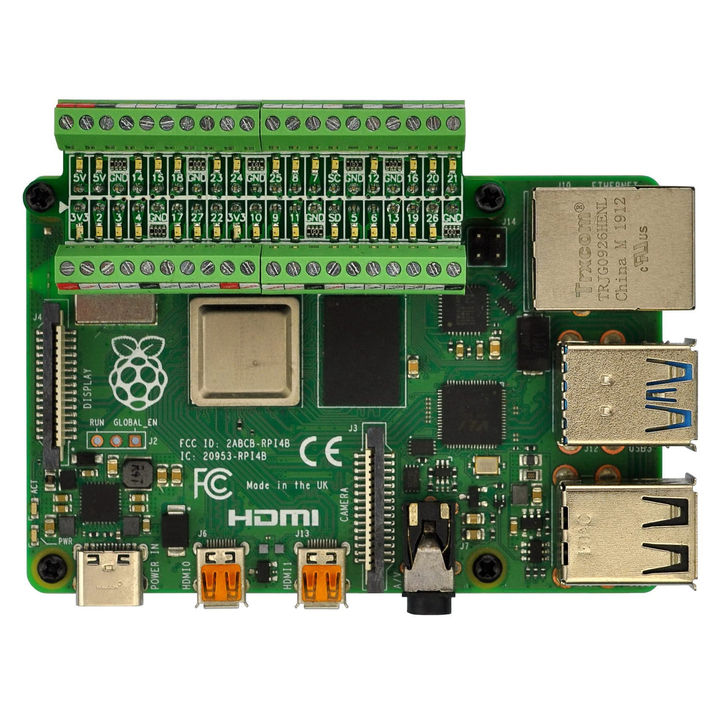 - 2x20 positions header connect to Raspberry Pi board. FR-4 fiber glass PCB, dual copper layers.