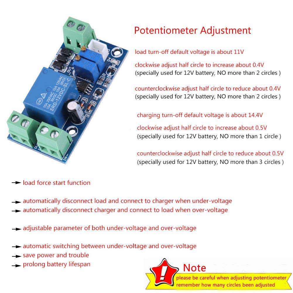 Features: This is an undervoltage switching module that automatically turns off the load when the voltage falls below a specified level Value falls. Then it will automatically connect to the charger to charge the battery. When the battery voltage rises to a set value, the module automatically turns the load back on and stops battery charging. Designed with an LED indicator that shows whether the load is off or on. By simply adjusting the potentiometer, both the turn-off and turn-on voltage values can be adjusted. This control board helps you save power and extend battery life. Specifications: Suitable battery voltage: 12V Voltage error: ± 0.1V Load current: 10A Size: 6 3 1.8cm / 2.4 1.2 0.7in Weight: 24g (approx.) Package includes: 1 x Control Board< /p>