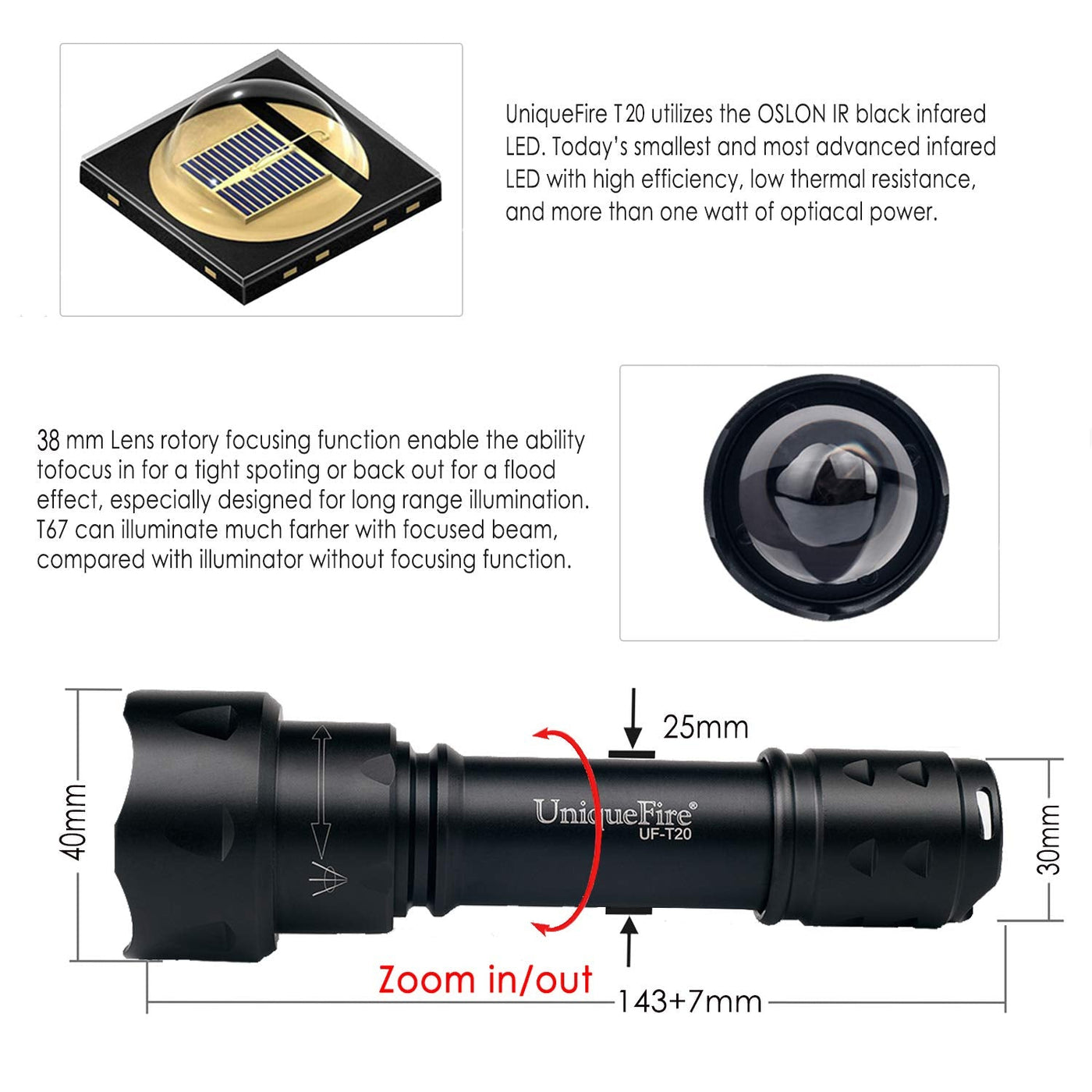 - 38 ASPERICAL LENS: 38MM Lens rotary focusing function enable the ability to focus in for a tight spotlight or back out for a flood effect, especially designed for long range illuminations. T20 can illuminate much farther with focused beam, compared with illuminator without focusing functions.