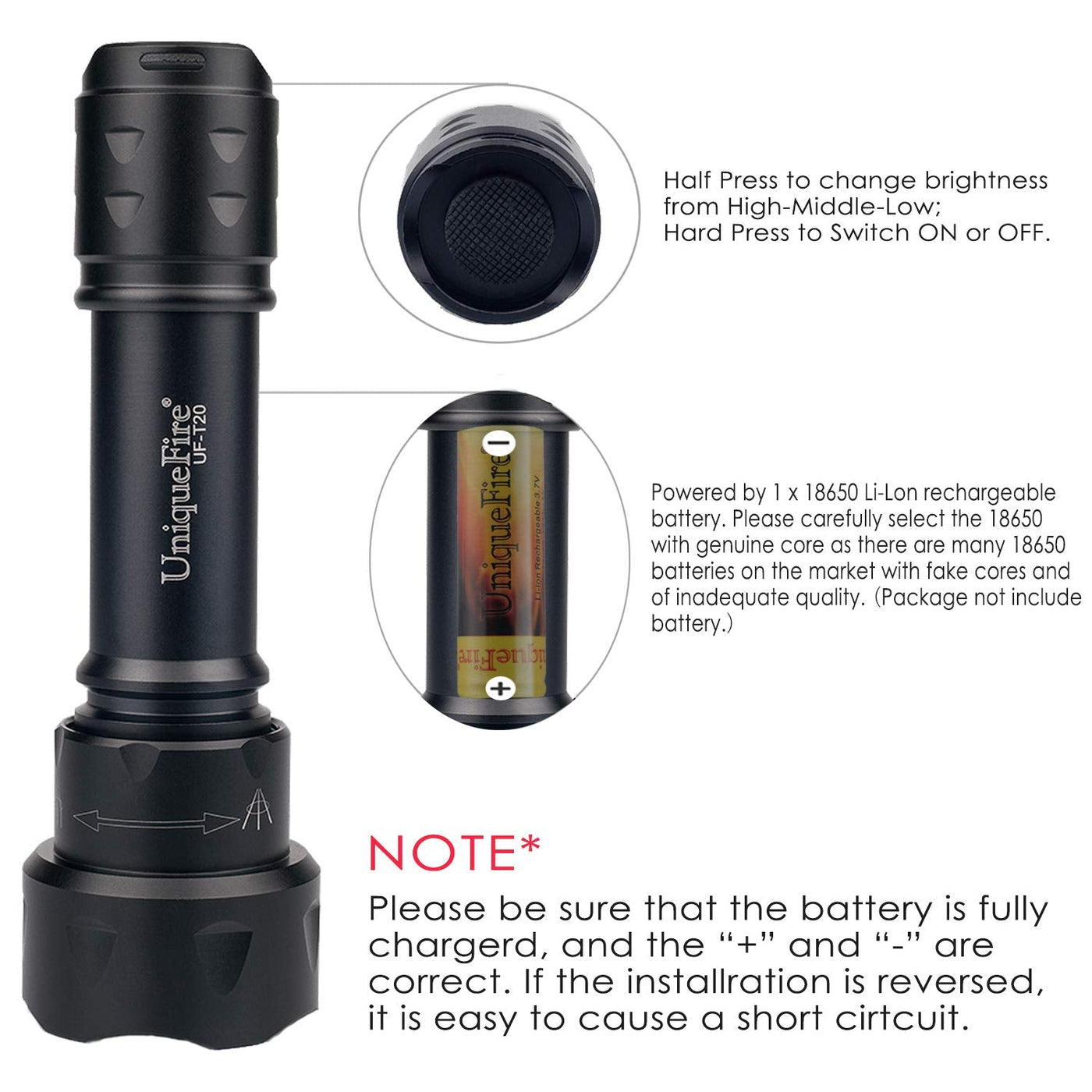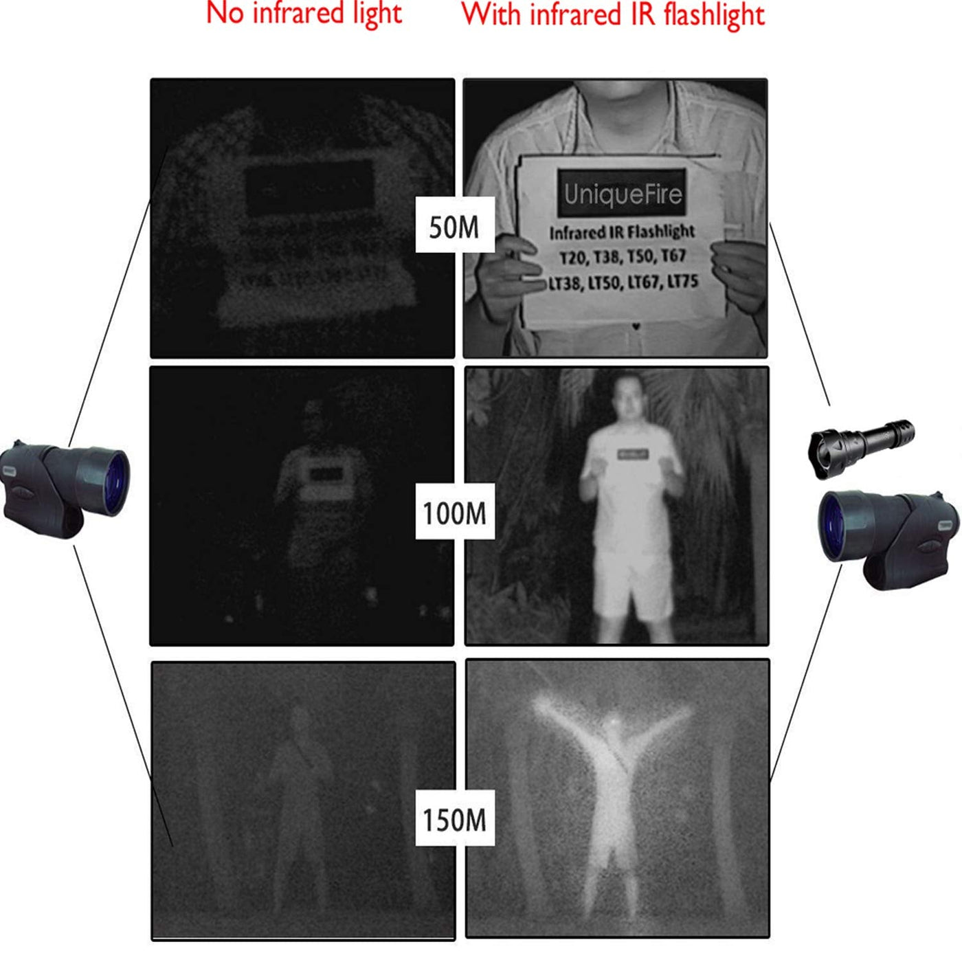 UF Series IR Flashlights UF series is available in a full range IR flashlight . They are suitable for a wide variety of Night Vision Camera or Scope, and become essentials for every Hunting. There is always a IR flashlight you want and you won't regret having it. Read more Night time hunting is a rapidly growing sport with the use of night vision devices (NV). In order to go night hunting using NV, a night vision scope paired with an infrared light, or IR illuminator is needed to see targets in complete darkness.The UniqueFire Night Hunter T20 T38 T50 T67 T75 (Infrared) LED torches put out invisible 'black' light in the 850nm or 940nm range. They are the Infra-Red illuminators designed for those who own Night Vision gear such as rifle scopes, binoculars, goggles or spotting scopes. Due to their large heads and a good distance between IR LED and aspheric lens, the UniqueFire T20 T38 T50 T67 T75 range of IR LED torches can make a tremendous IR (Infra-Red) illuminators, well suited to those who want to substantially increase the range and clarity of their existing Night Vision riflescope, binoculars or scope.UF series infrared hunting light is a great companion to a digital night vision device.The beam focus works very well and enabled you to clearly pick out objects at far over 100 yards.This is a good quality IR flashlight that is well designed and well built. If you're going to add an IR light to your NVS, you can't beat the value this light gives you!PACKAGE: 1 x T20 850nm Flashlight ONLY ( Not included battery ) ABOUT US UniqueFire is the preminm brand.Our products involves the Hunting,Lighting and Night Fishing . We are one of the most professional IR flashlight manufacturers in the world, focus on IR Light technology about shoting and hunting.Grounded in the latest and precision technologies, our products bring the essentials of hunter enthusiasts around the world. UniqueFire offers the broatdest array of innovative solutions developed by our Innovation,Ingenuity,and Integrty. UF-T20 IR Flashlight Upgraded 5W IR 850NM LED-4715AS Utilizing infrared light black 850nm LED emitter - today’s smallest and most advanced infrared LED with high efficiency, low thermal resistance, and more than 5 Watt of optical power. It can produce a powerful punch with approximately 100-150 meters range with focused beam. Suitable to use with a night vision scope, NVS, NVG DIY, camera phones, monocular, goggles and camera which doesn't block infra red light 38 mm glass aspheric convex Lens 'O' ring sealed waterproofing Glow-in- the-dark switch (standard) Batteries Input Voltage: 3.7-4.2 V Lighting Distance: 50 M - 150 M Beads Life:More than 10,0000 hours Power source: 1 x 18650 3.7-4.2 V batteries (not included battery) Please beware that: Only a small and faint red glow on the LED to show you that the torch is on. Read more 3 Mode System with Mode Memory setting T20 remembers and turns on to the last setting that it is operated on: On/Off Operation: Hard Press The Tail Switch Until it Clicks (Complete Press) to ON/OFF The Torch. Mode Selecting: With The Light On, Gently Press(Half-way Press) The Tail Switch to Switch Each Mode From High/med/low . 38MM Aspherical Lens 38MM Lens rotary focusing function enables the ability to focus in for a tight spotlight or back out for a flood effect, specially designed for long-range illuminations.T20 Night hunter can illuminate much farther with a focused beam, compared with illuminator without focusing functions. Adjustable Focus The T20 IR LED flashlight has an adjustable focus from spot to flood. This adjustable focus is achieved by screwing the head (rather than push/pull) so the torch is more resistant to recoil on heavy rifle calibers if mounted on a firearm. Dimension: Head diameter: 38mm Body diameter: 25mm Length:143mm Net weight: 170g Compatible Battery 1x 18650 li-ion rechargeable battery Caution: CR123 battery will NOT work with this torch/Please do not use CR123 in case of damage to the torch circuit. Please be sure the battery is full charged. The”+”and”- “are correct. If the installation is reversed , it is easy to cause a short circuit. A quick change LED pill system The UF-T20 has unique feature a quick change LED pill system that enables the color of LED to be changed easily from red, green, white or infrared without the use on any specialist tools. (Extra LED pill purchased separately) 850nm VS 940nm BE AWARE that not all infrared cameras & night vision scopes will pick up 940nm IR light. This is because 940nm is much further away from the visible light spectrum than 850nm making it harder for a camera sensor to pick up. Check that the camera equipment you are using is compatible before you buy. The Perfect IR Illuminator for Your Night Vision Needs: Ward D vision Yukon Photon Pulsar N550/750 Armasight Drone Pro NiteSite NS50/200 Viper-WolfDIY Night Vision riflescope, binoculars or scope. Read more Cold Weather All Lithium-Ion powered LED torches to work well in cold weather, the night hunter IR Infra- Red LED hunting flashlight being rated from -20o C to +60o C Illumination Distance Illuminated dark areas up to 200 yards out when focused down to a spot, Floodlight to 100 yards with adding this to GEN 1 NVGs when Shooting coyotes fox Hog Wild Pig Varmint Predator Deer. Usage and Maintenance We recommend the use of high-quality batteries. If the flashlight is not to be used for an extended period, remove the batteries, or the flashlight can be damaged by electrolyte leakage. Please do not disassemble the sealed head, as doing so can cause damage to the flashlight. Read more UF-T20-850 Kit UF-T20-940 UF-T20-Pressure Switch UF-T20 Red Beam UF-T20-850 Beam UF-T20-365 with Battery Light Color IR 850nm IR 940nm Red Light IR 850nm Blacklight 365nm Modes 3 Modes 3 Modes 3 Modes 3 Modes 3 Modes 3 Modes Adjustable Focus ✓ ✓ ✓ ✓ ✓