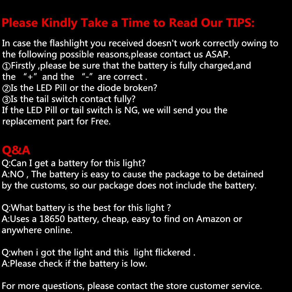 - CAN ONLY BE POWERED BY BATTERY, NEVER USE CR123A: With operating voltage of 3.7-4.2V, It is powered by Li-Lon rechargeable battery. It cannot be powered by 2 x CR123A battery, as 2 x CR123A with 6V voltage will burn the driver board. Please carefully select the 18650 with genuine core as there are many 18650 batteries on the market with fake cores and of inadequate quality.(BATTERY IS NOT INCLUDED )