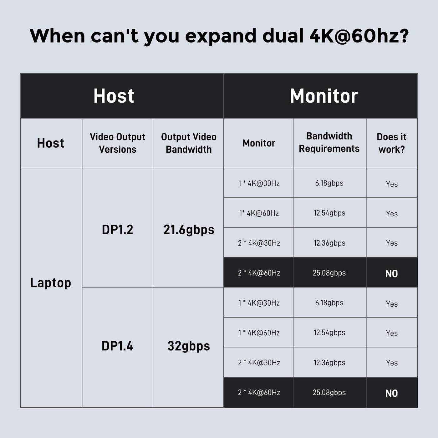 - Dual 4K of Display Support: The usb docking station supports dual 4K@30-60Hz, Ideal for DP1.4 laptops to extend to dual 4K@30-60Hz displays (Note: MacBook supports only one extended monitor).