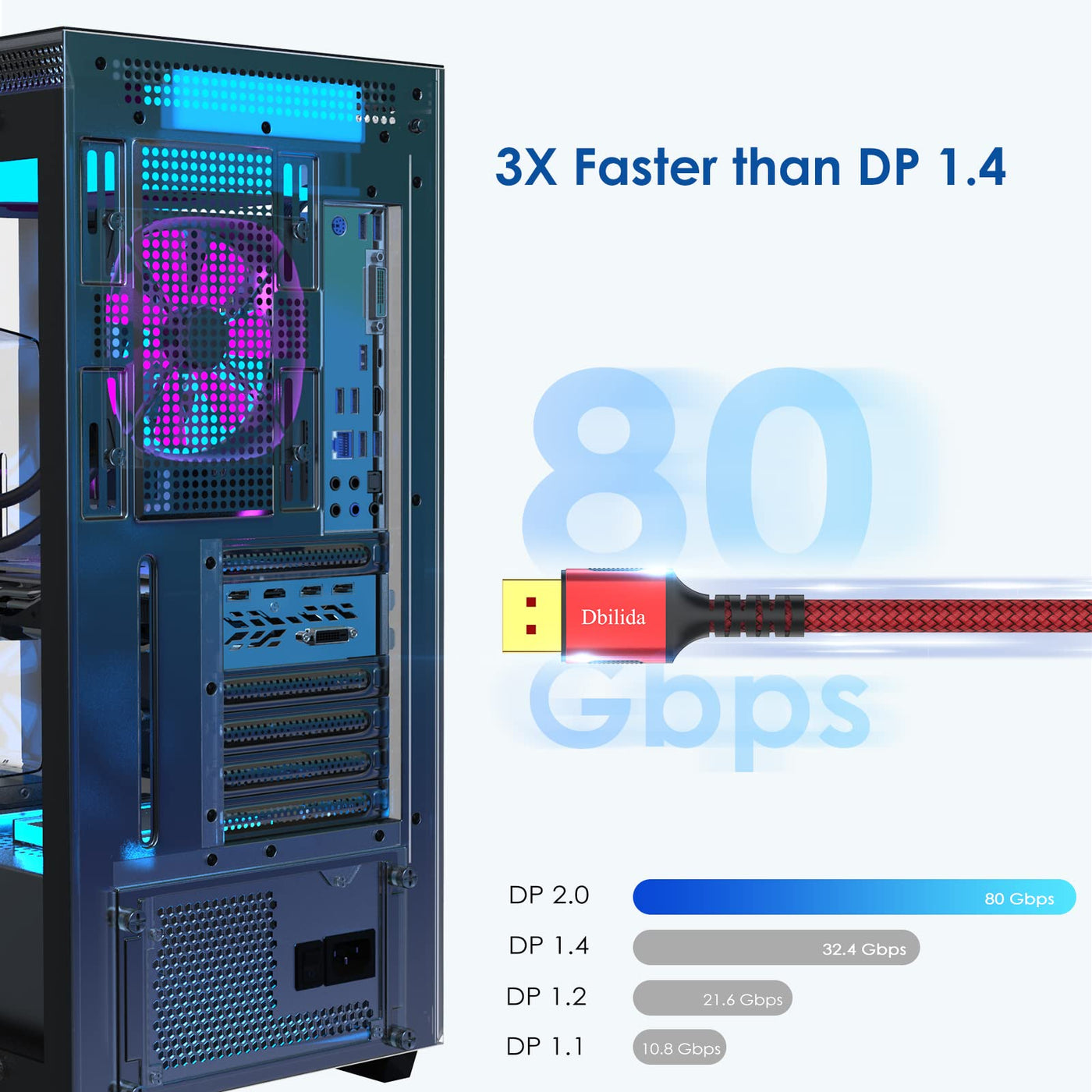 - Hassle - free Lifetime WarrantyDbilida 80Gbps displayport 2.0 cable provides free lifetime replacement or refund if the cable have any quality issue. Please contact us via your order list. Address your order ID and then click button"contact seller"
