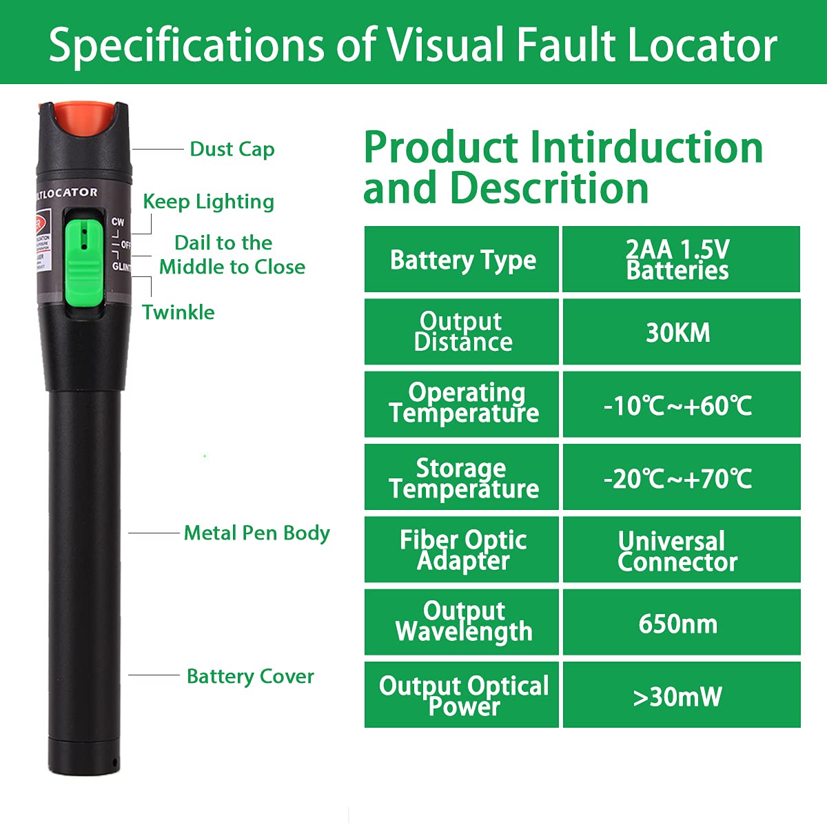 - This 30mW VFL has a strong red light output and can transmit up to 30 kilometers in optical fiber. The efficient power circuit ensures a stable power supply.