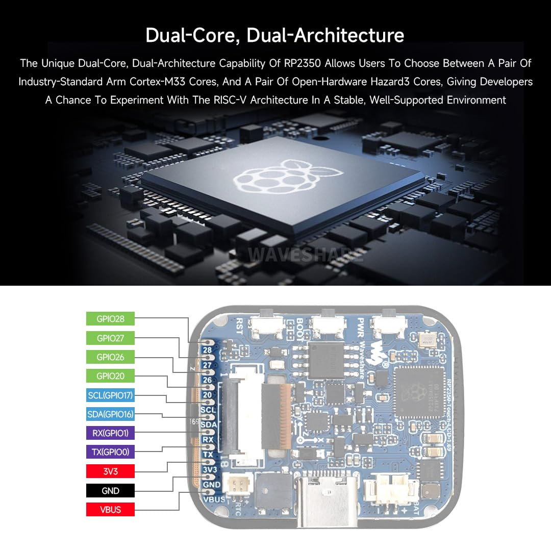 - Advanced Microcontroller Design: The RP2350-Touch-LCD-1.69 features a unique dual-core architecture with a dual-core Arm Cortex-M33 processor and a dual-core Hazard3 RISC-V processor, providing flexibility and performance with clock speeds up to 150 MHz.