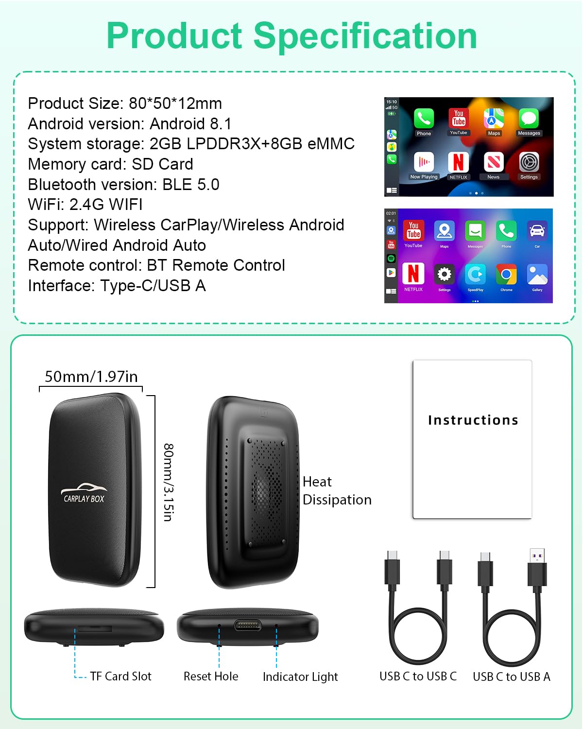 - Enjoy Streaming ExperienceWireless car play dongle for iPhone apple has built-in Netflix and YouTube, it can play all kinds of interesting videos, so that you are not bored while driving. In addition, the wireless carplay adapter Netflix also built-in TF card slot, so you can use the SD card to play videos or music offline when there is no WiFi and hotspot. With ample storage space (2GB RAM+16GB ROM, TF card support up to 256GB), you won't have to worry about running out of space.
