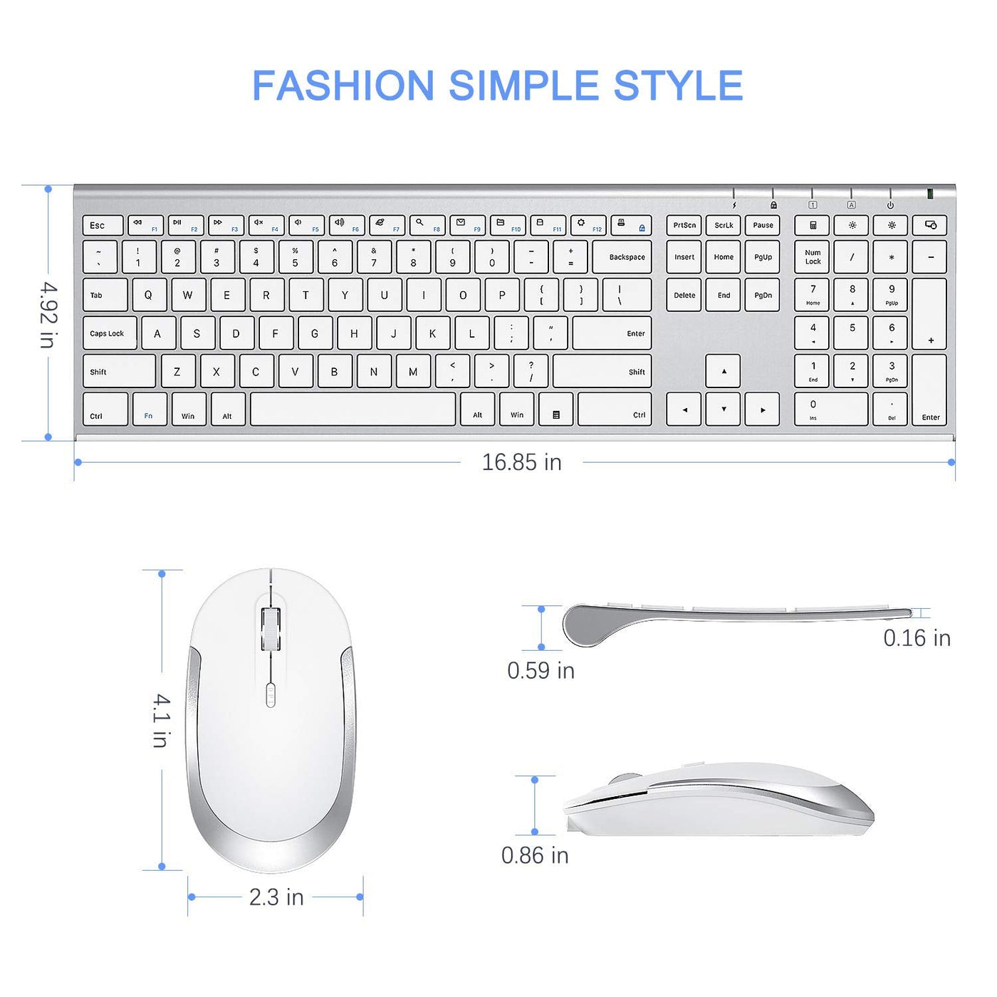 Ultra Slim Wireless Keyboard and Mouse Combo Vssoplor Ultra Slim Wireless Keyboard and Mouse Ultra Slim Design Ultra slim (5.5mm) full size keyboard looks more stylish and elegant, perfect for saving desk space. Low-profile keys are responsive & quiet and similar to a laptop keyboard. You can type anywhere without worrying about disturbing others True plug and play With reliable 2.4GHz Wireless Connection, you do not need to worry about too many messy cables. True plug and play,the keyboard and mouse will connect automatically in seconds Rechargeable Keyboard and Mouse Keyboard and mouse are both rechargeable and do not require battery replacement. The keyboard can last up to 4 months with a single full charge(Standby time varies according to the user's working hours). With caps lock Indicator, you will never enter the wrong password HIGHLIGHTS Ultra Thin Full Size Low Profile Sleek Look Plug & Play Setup 2.4G Wireless Connection Caps lock indicator Long battery life Rubber keyboard cover Read more Special Features Plug and Play & Share One Dongle You only need to plug in the USB receiver, the keyboard and mouse will automatically connect to the device and ready to use. They share one USB receiver and only need to occupy one USB port of your device Exquisite and Sleek Look This keyboard can satisfy your pursuit of premium quality. Its' sleek and ultra slim look (5.5mm) makes your desk cleaner and more stylish Rechargeable Keyboard Mouse Built-in lithium battery is easy to use and saves money. The keyboard and mouse can last for more than three months for daily use with a single charge Read more Scissor Switch Keys High-End Scissor Switch design provides a comfortable and whisper quiet typing experience. It will rebound quickly and its' touch feedback will make you fall in love with typing Quiet Click & High DPI With a mute mouse, you can work anywhere, anytime, without worrying about disturbing others. 3 Mouse DPI Levels 1000/1600/2400 allows you to change the cursor sensitivity easily and track more smoothly over a variety of surfaces Wide Compatibility Keyboard Dimensions: 16.9 4.9 0.12 in Mouse Size: 4.1 2.3 0.86 inch Compatible with Windows XP / Vista / 7 / 8 / 10 or later Read more