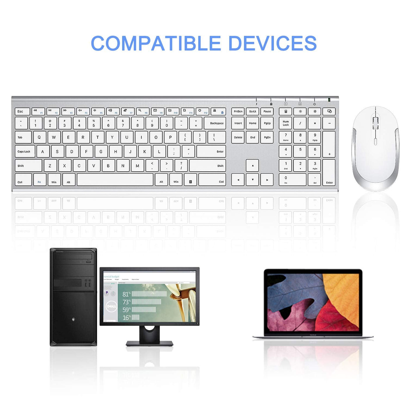 Wireless Keyboard and Mouse, Vssoplor 2.4GHz Rechargeable Compact Quiet Full-Size Keyboard and Mouse Combo with Nano USB Receiver for Windows, Laptop, PC, Notebook-White and Silver White and Silver