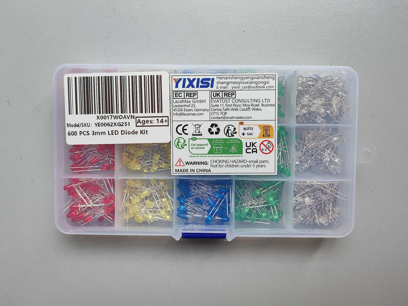- Package includes: 3mm LED diode kit, red, green, yellow, blue and white LEDs, total 600 LEDs. (120 per color)