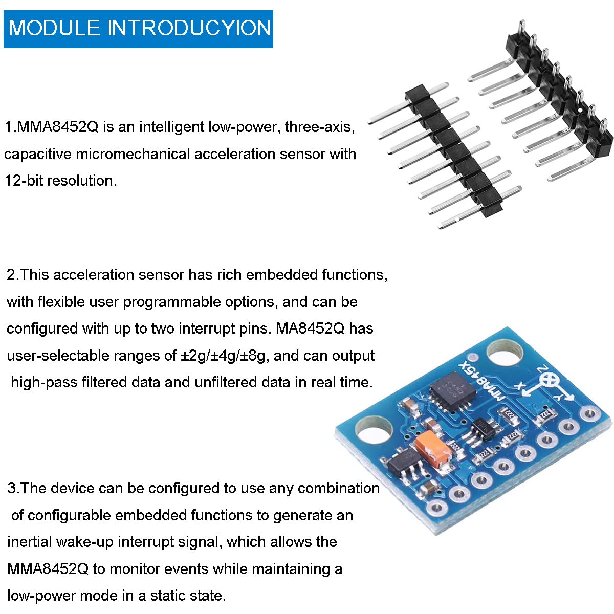 - Range selection: Support MMA8452Q 2g/4g/8g range for selection, it is capable of filtering data with high output power or data without filters.